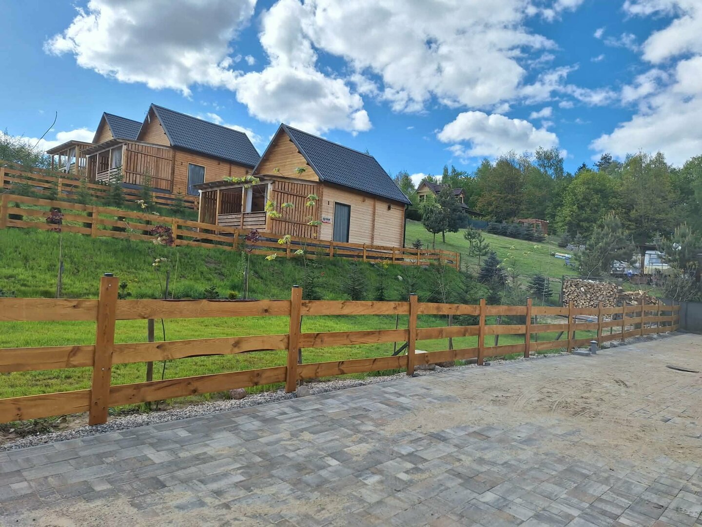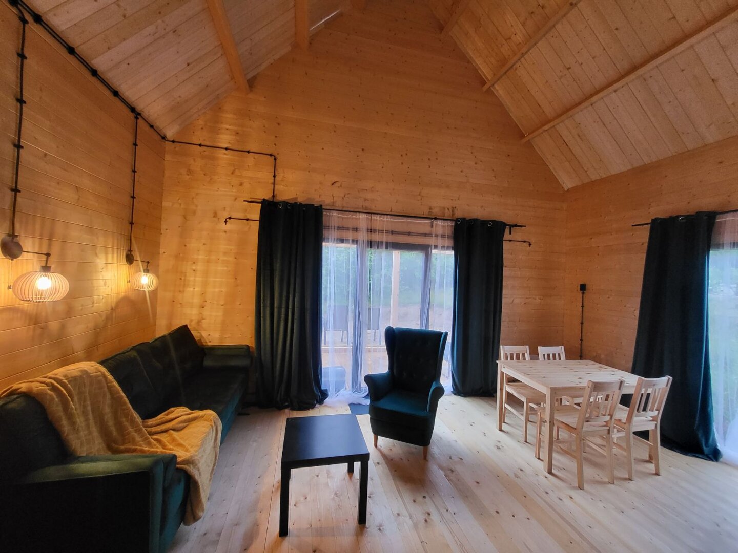 Domek nr 4 "Zielony" ma ok 55m2. Posiada na parterze: sypialnię małżeńską, salon z rozkładaną sofą, aneks kuchenny, łazienkę. Na piętrze antresolę z miejscem do spania dla trzech osób (jeden pojedyńczy materac plus jeden podwójny materac). Salon ma wygodną sofę oraz duży stół w części jadalnianej.  Kuchnia posiada pełne wyposażenie w naczynia, sztućće, garnki, płytę indukcyjną oraz dużą lodówkę z zamrażarką. Przygotowywanie posiłków to u Nas przyjemność. Domek ma duży zadaszony taras z wygodnymi meblami ogrodowymi odpowiednimi do odpoczynku oraz biesiadowania. Grill oraz miejsce na ognisko znajduje się przy domku i jest do prywatnego użytku.